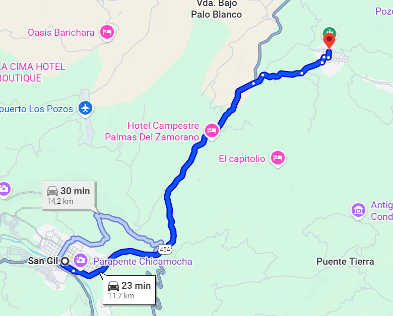 Es la ruta más corta. Curití está ubicado a solo 20 minutos del centro de San Gil. La carretera es completamente pavimentada, con curvas suaves y señalización adecuada, lo que permite un recorrido tranquilo y seguro. Por ello, la mayoría de turistas que visitan San Gil suelen incluir a Curití como parada obligatoria.